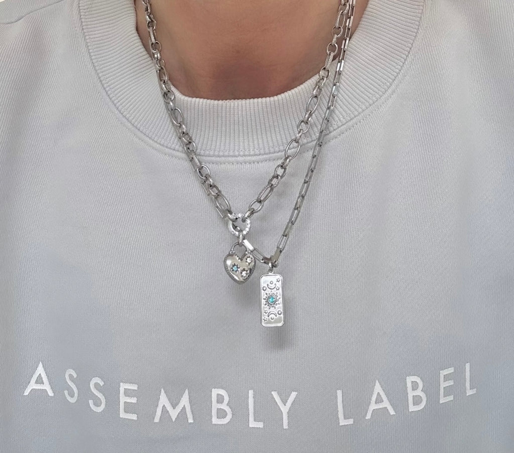 This charm depicts the sun, moon and stars. It comes on a box link chain and everything is silver stainless steel so it will never tarnish. To adjust the length you can wear it shorter, just clip it on any link at the back.