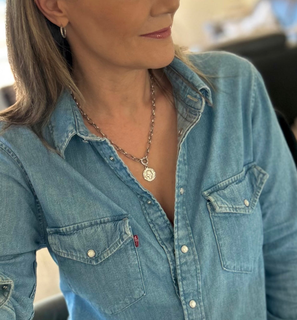 Silver stainless steel coin and chain. You can adjust the length to suit with the clasp at the back.